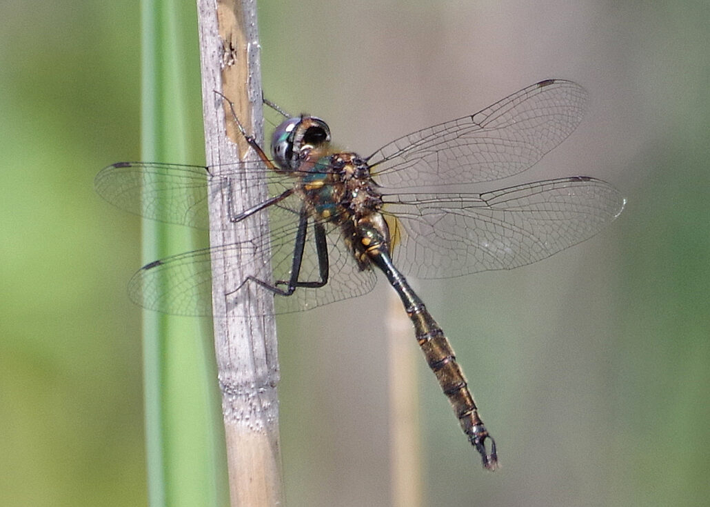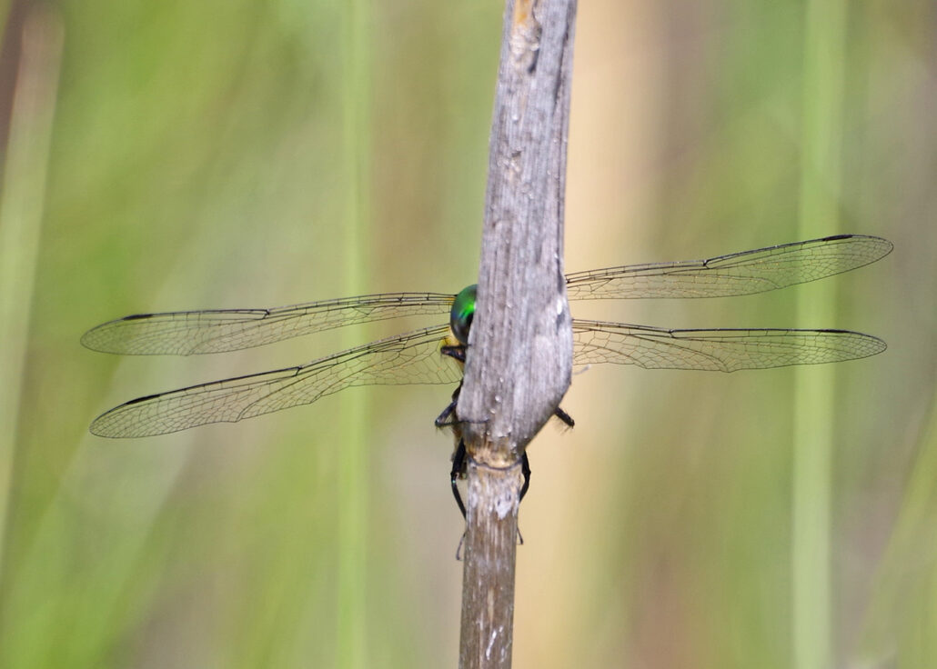 The Striped emeralds are, as the Wisconsin Odonata Survey website points out “uncommonly seen, but this may be largely due to their secretive nature.”  It goes on to say that “the medium-sized, dark brown striped emeralds have some pale markings on the thorax and abdomen, black legs, clear wings and brilliant green eyes. The thorax has a metallic bronze-green sheen and the abdomen is dark metallic black-green.”  While some species live in the South, many are dragonflies of the North country, even living above the treeline.