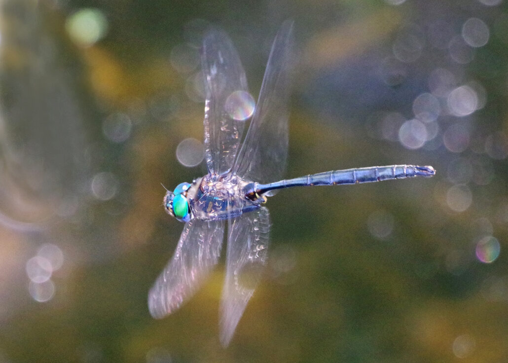 Emerald species are hard to tell apart in flight, but male Brush-tipped Emeralds have, well, a brushy tip https://www.bugguide.net/node/view/185242/bgimage that can be imagined as it flies by – as Kurt Mead says in Dragonflies of the North Woods, “the whiskered tips of the male Brush-tipped’s abdominal appendages are unlike those of any other North American species” of Somatochlora “ (though the appendages of other species are not hairless) If they sit still long enough, you can see that the metallic-green abdomen has pale yellow spots https://www.bugguide.net/node/view/1566444/bgimage that can help narrow down the identification.  Adult Brush-tipped Emeralds are about two inches long; males have short abdomens and females have proportionately longer abdomens than males.