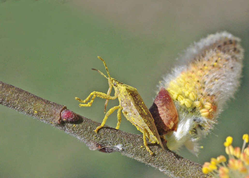 BROWN STINKBUG – Some species of brown stinkbug are vegetarians, but the BugLady thinks that this is one of the predatory stinkbugs. The BugLady wonders if the heavy dusting of willow pollen works as an inadvertent disguise.