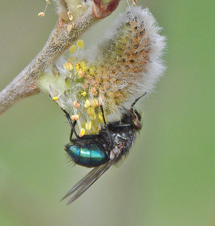 Remember that pollination is an accidental service performed by animals that visit the pussy willows for another purpose altogether – to perch, to set up housekeeping, to browse an important, early food source (the male flowers produce a little nectar and a lot of pollen, and female flowers supply nectar), or to browse the browsers. Mining bees and syrphid flies made up the majority of the insects that the BugLady saw, with flies (blow, flesh, and house) next. The BugLady also saw a spring azure butterfly checking out the willow flowers.