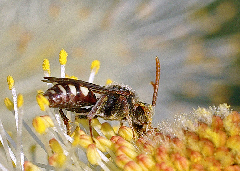 SWEAT BEE – Sweat bees collect prodigious loads of pollen and transport it to their underground nests. Most are solitary; a few are marginally social.”